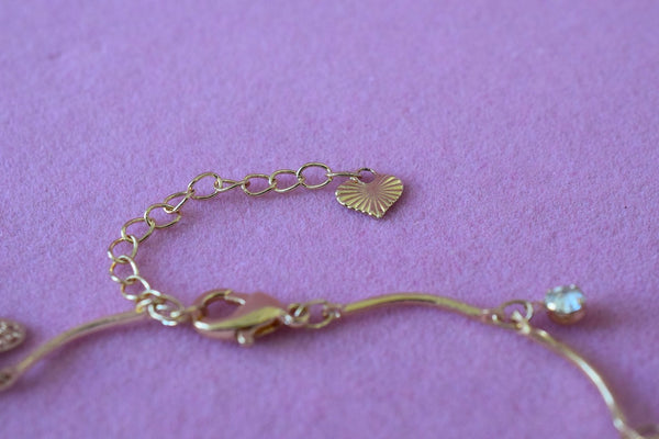 18k gold plated adjustable charm bracelet with butterflies and round white stones.