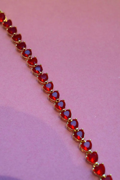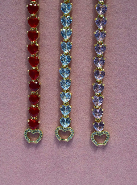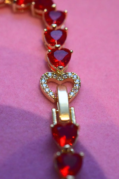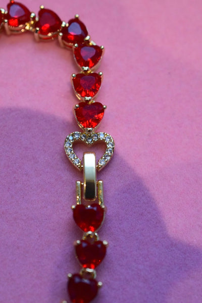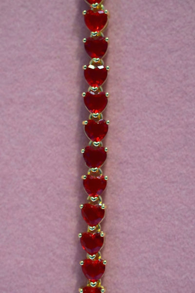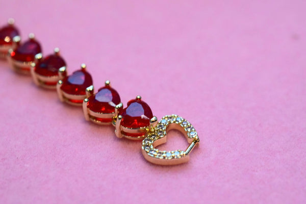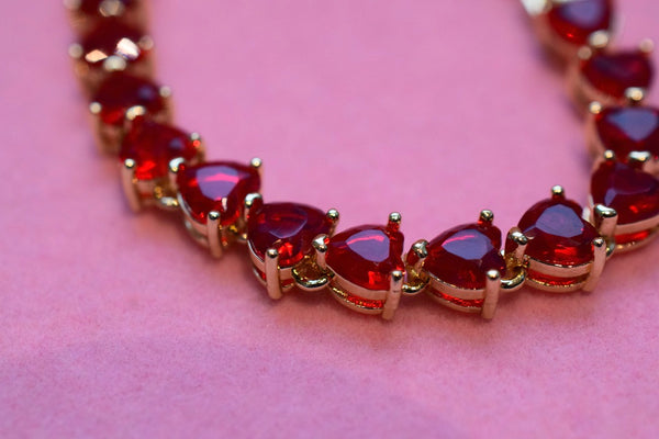 Stone Colors & Shapes: The main stones which are heart shaped are red, which is inspired by ruby. And on the heart shaped clasp we have white round stones, inspired by white diamonds.