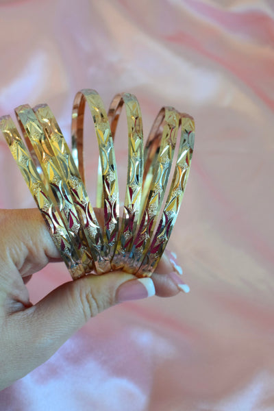 18k tricolor (yellow, white, rose) gold plated women's 7 bangle set with a unique engraved design. It is mostly yellow gold, and has white and rose gold details.
