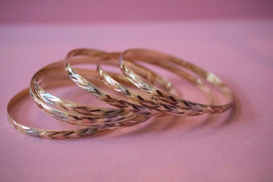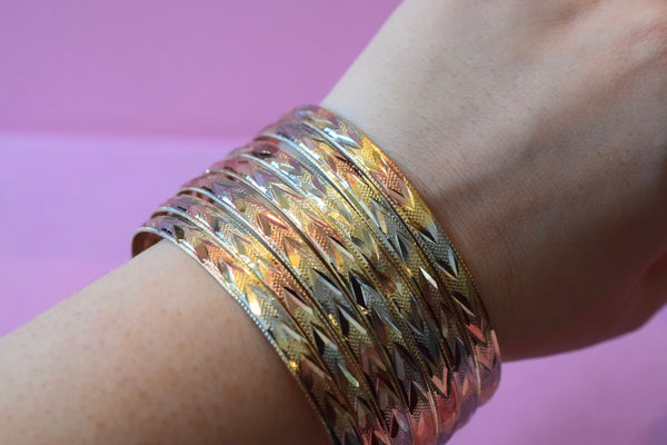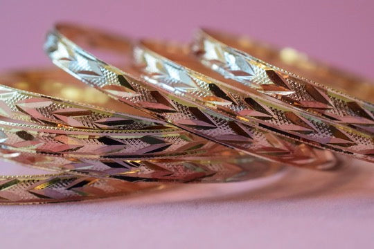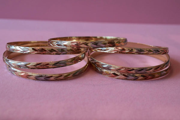 18k tricolor gold plated women's 7 bangle set with a unique engraved design.