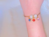 Beautiful and classic gold plated figaro chain bracelet with birthstone inspired dangling stones, and shiny divider balls.