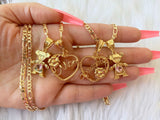 These are two heart pendants that are attached at 1st and breakable to become 2. These matching mother daughter pendants have a floral design and say "Mother" and "Daughter" on them. They also come with your choice of a birthstone charm on each one, and they also come with 2 figaro chains. The pendants and the chains are gold plated.