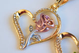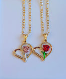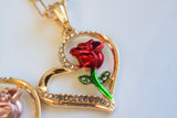 This is a beautiful gold plated heart necklace featuring diamond inspired round stones, and a rose in the center. You have the option of 2 different roses. One of the roses is red with green stem/leaves. The other rose is rose gold plated, with white gold plated stem/leaves. The chain is a classic gold plated figaro chain. The pendant is medium to large in size.