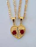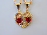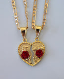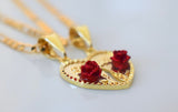 This is a breakable gold plated heart on the smaller side. On the heart states Te Amo and each side has a 3D red rose. The pendant comes with 2 classic gold plated figaro chains.  If you wish to not split it, you can place one of the chains through both loops. Please state lengths in note box in cart.