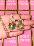 This is a somewhat large gold plated Virgin Mary necklace with a stunning floral design. It comes in 2 choices. All yellow gold, or red and green enamel inspired detailing. The pendant also comes with beautiful white stones, inspired by diamonds. This pendant sits on a classic gold plated figaro chain.