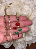 Beautiful 3D gold plated rose with red and green enamel inspired detailing. The chain is a classic gold plated figaro chain.