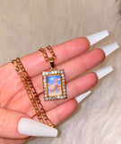 The most adorable necklace! This is a framed image of Baby Jesus encrusted with shiny white stones that look like diamonds. The chain is a figaro chain in the length of your choice. Both the pendant and the chain are gold plated.