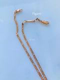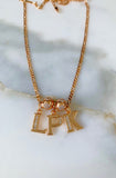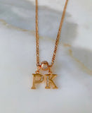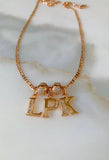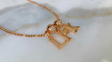 Beautiful champagne (mix of yellow and rose) gold initial pendant, encrusted with cz stones that are inspired by beautiful diamonds. The initials are divided by our floral cz champagne gold slider ball pendants. The chain is a gold plated figaro chain.