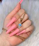 Gold plated dainty iced out Hamsa with a blue protective eye, front and center. The chain is a classic gold plated cuban link chain.
