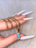 Gold plated dainty iced out Hamsa with a blue protective eye in the shape of a heart, front and center. The chain is a classic gold plated cuban link chain.
