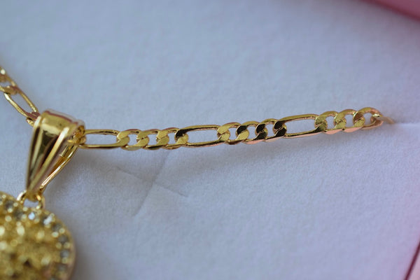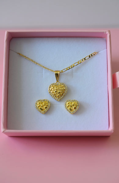 This is a package deal of our icy nugget heart necklace and earrings. They are 18k gold plated with cz stones. The earrings are push back studs. The chain style is figaro.