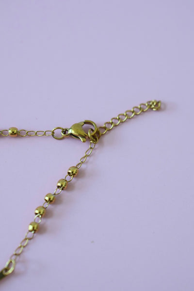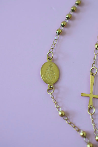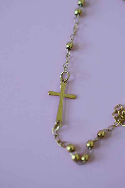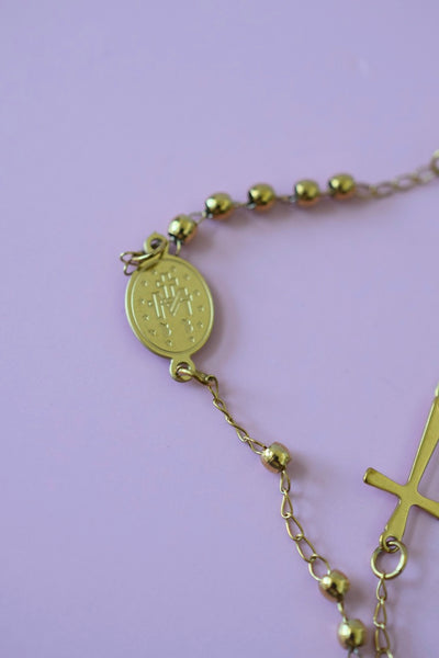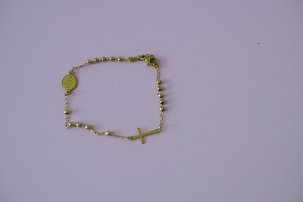 18k gold plates rosary style bracelet with a cross and Mother Mary medallion. This women's bracelet is adjustable due to the extender chain. It can be worn between 7 1/2 to 8 1/2 inches. The beads and bracelet design is on the dainty side.