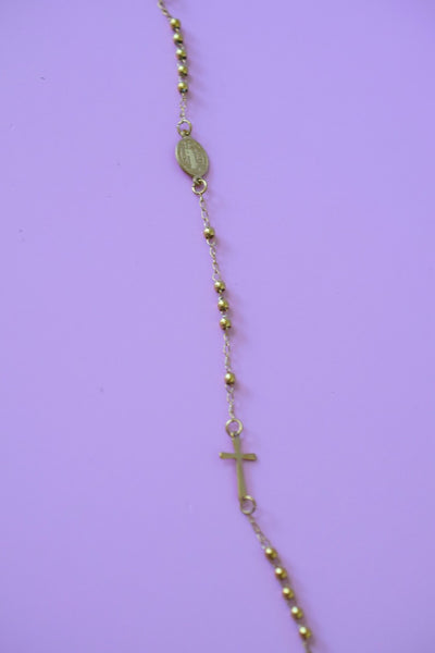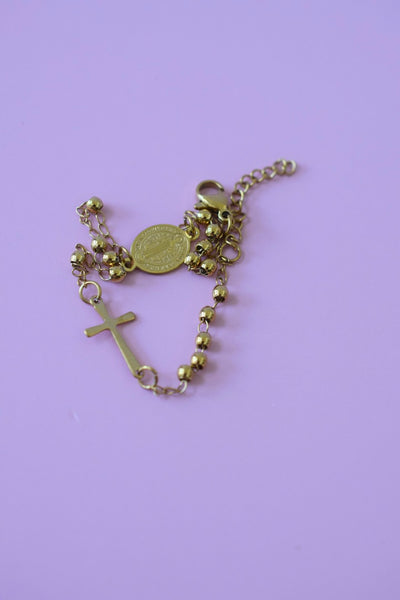 18k gold plates rosary style bracelet with a cross and Saint Benedict medallion. This women's bracelet is adjustable due to the extender chain. It can be worn between 7 1/2 to 8 1/2 inches. The beads and bracelet design is on the dainty side.