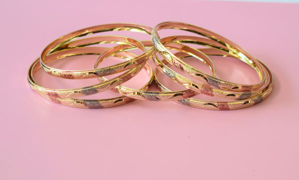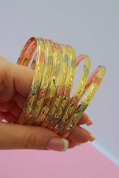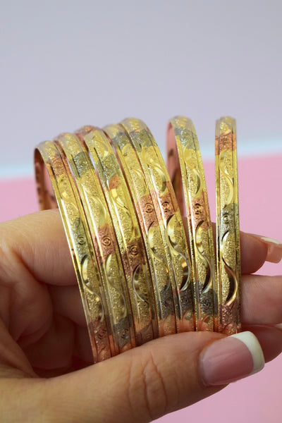 18k tricolor gold plated women's 7 bangle set with a unique engraved design.