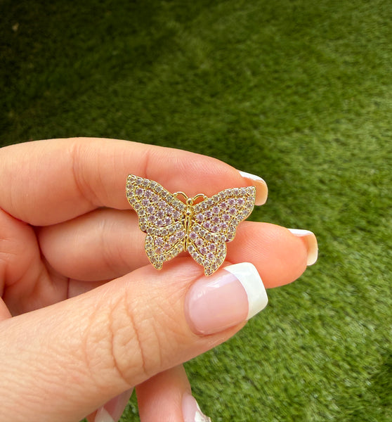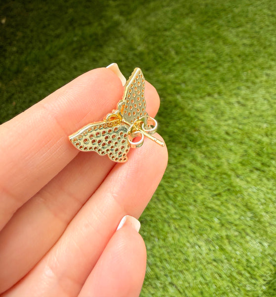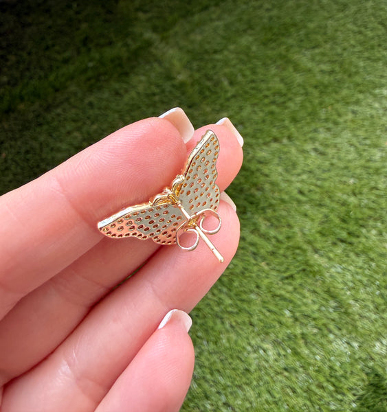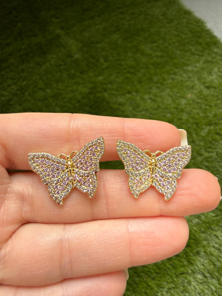 Only 1 was made of this beauty! This is is very high quality 18k gold plated and cubic zirconia pair of butterfly earrings. The quality and craftsmanship replicates fine jewelry made with flawless and rare pink and white diamonds. These are micro pavé set stones which a very labor intensive. The butterfly is 1 inch wide. It is considered a large sized stud earring. The backings are classic pushbacks. Respectfully, this is not cheap mass produced jewelry. This is truly a work of art.
