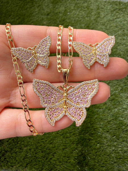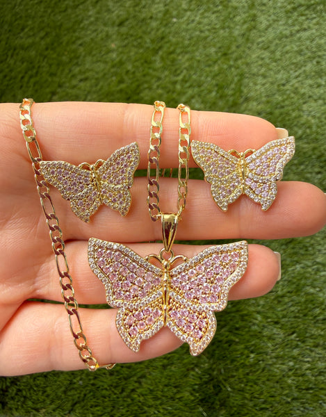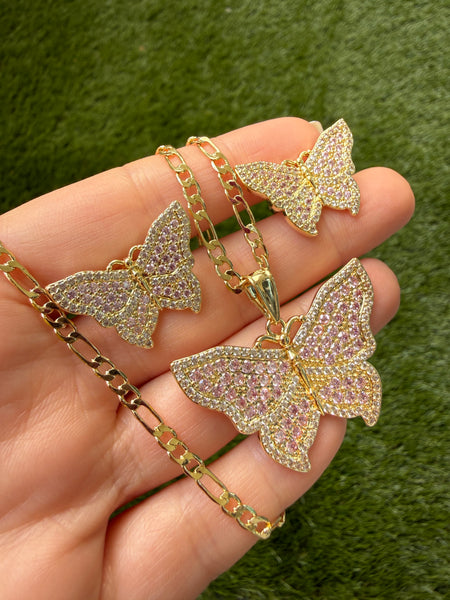 Only 1 was made of the earrings and only 1 of the necklace too! This is is very high quality 18k gold plated and cubic zirconia pair of butterfly earrings and necklace. The quality and craftsmanship replicates fine jewelry made with flawless and rare pink and white diamonds. These are micro pavé set stones which a very labor intensive. The butterfly on the earrings are each 1 inch wide. It is considered a large sized stud earring. The backings are classic pushbacks. The pendant is almost 1 1/2 inches. That is considered a large pendant. Respectfully, this is not cheap mass produced jewelry. This is truly a work of art.