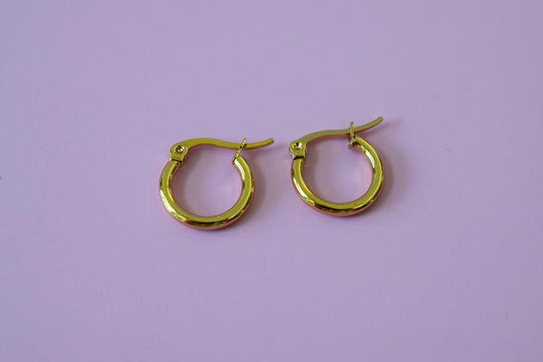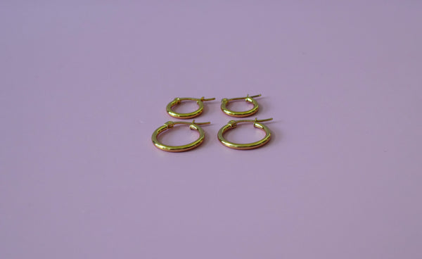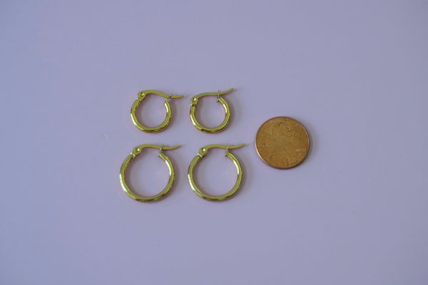 These are super dainty and small classic gold huggie hoops. We have them in extra small and small. You can either buy them both as a package deal or separately. The extra small is 1 1/2 cm wide. The small is 2 cm wide. We also included images of these huggies with a penny for more of a size reference.
