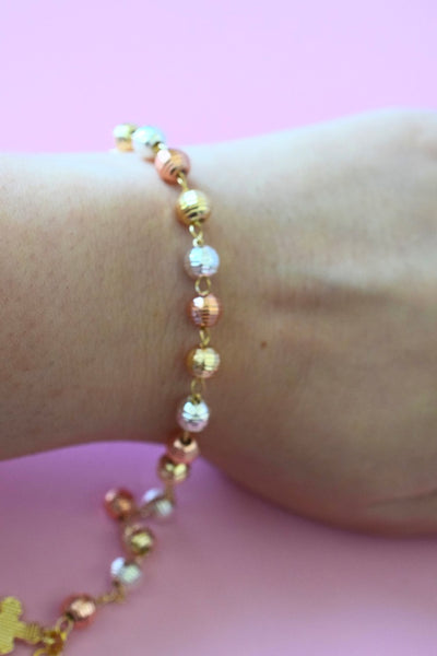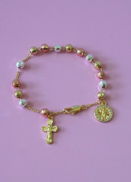 This is a gorgeous 18k tricolor gold plated rosary style bracelet. It has diamond cut thick rose, yellow, and white gold plated beads that give it a lot of shine. It has a little crucifix and a CZ baby Jesus charm. The clasp is a lobster clasp. The quality is amazing. This is a women's bracelet at 7 inches long.