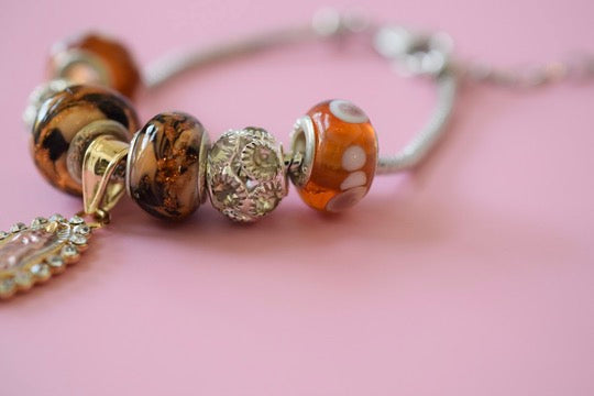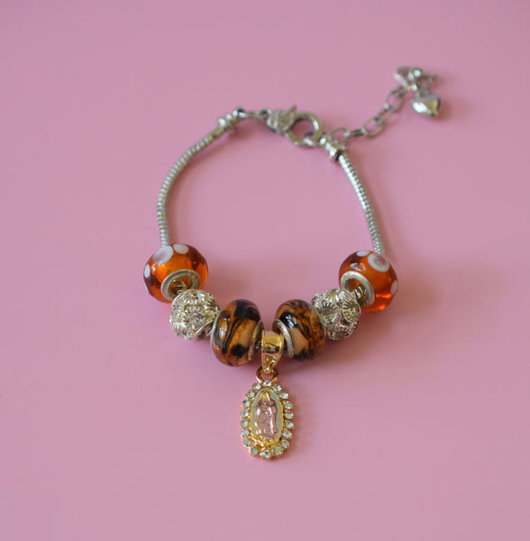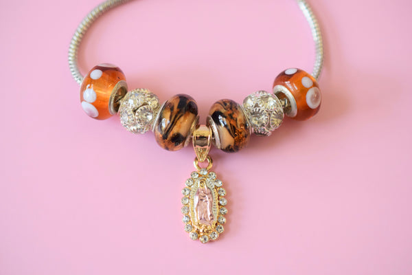 This is a one of a unique and kind charm bracelet. No one else will have it but you. The snake chain bracelet is adjustable between approx. 7 1/2 to 10 inches, making it suitable for any adult. The beads used to accent the center piece are handmade and vintage. They made of glass, ceramic, and solid sterling silver. The beads are stamped 925 verifying the authenticity of solid sterling silver. There is also alloy silver balls with cz stones. And in the center is a Mother Mary charm that is 18k tricolor gold plated with cz stones.