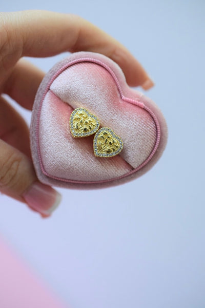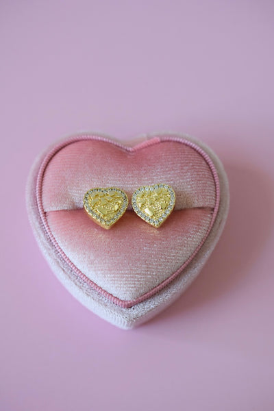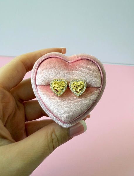 18k gold plated nugget style heart stud earrings with shiny white round cz stones.