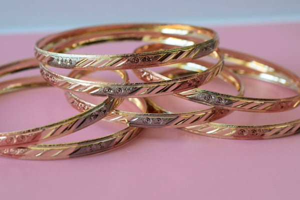 18k tricolor gold plated women's 7 bangle set with a unique engraved design.