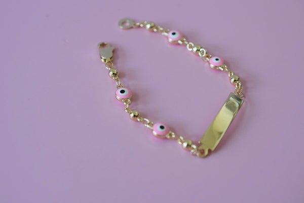 18k gold plated kids ID bracelet with pink eyes. The length is 6 inches.