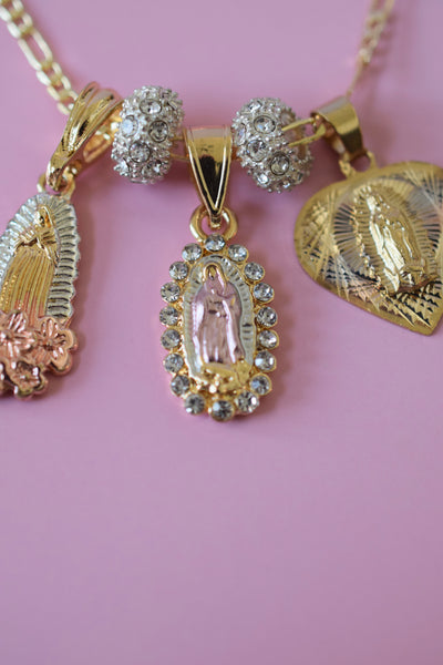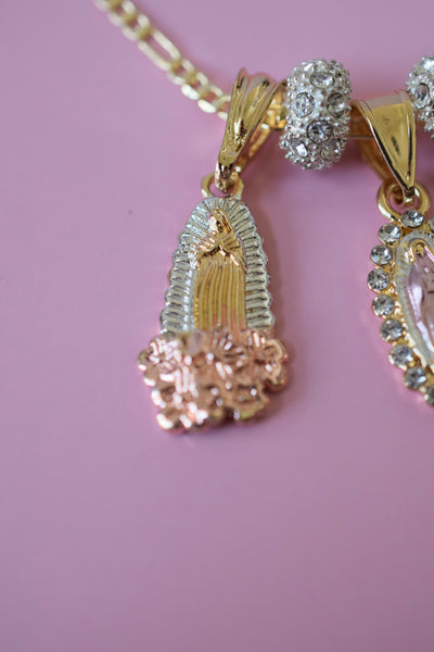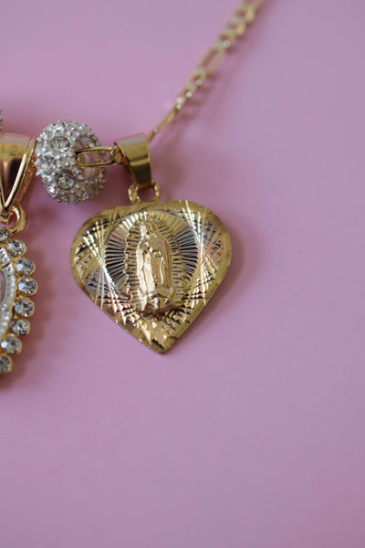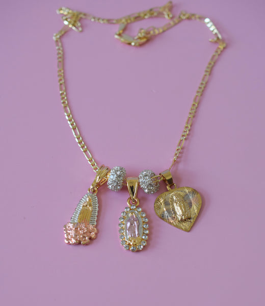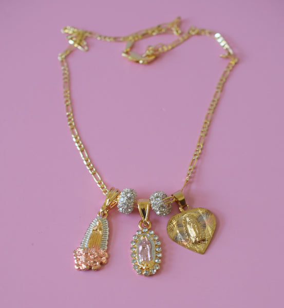 This charm necklace features our Diamond Cut Mary Heart, Tricolor Dainty Floral Mary, and our Icy Dainty Mary. The Mary in the middle is 18k gold plated. The other two are 18k tricolor gold plated. There are also shiny cz alloy silver tone balls dividing the charms. These charms can come off if you want to ever rearrange them or wear them on their own.