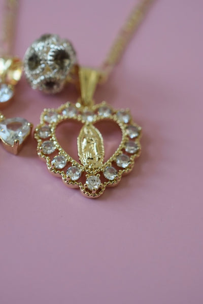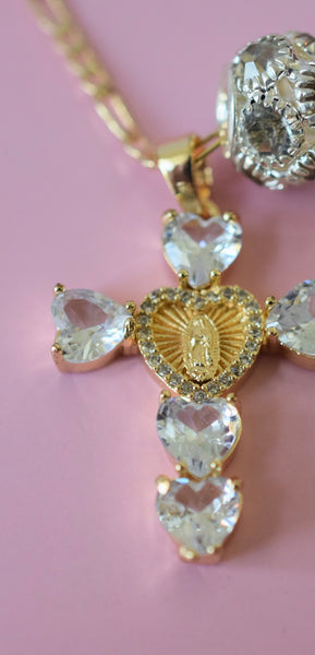 This is a combo of our Icy Mary Heart and our Heart Mary Cross. These charms are 18k gold plated with cz stones. There is also a cz alloy silver tone divider ball.