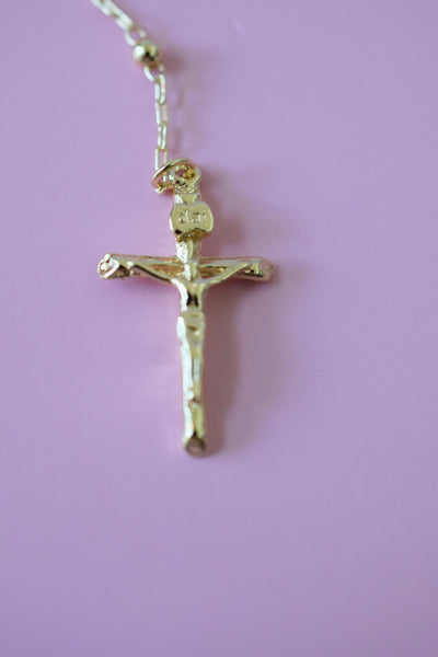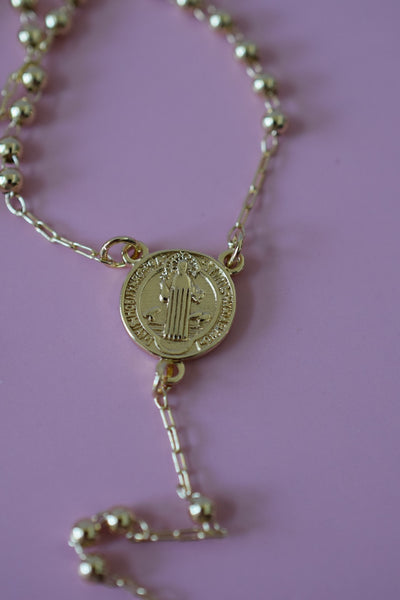 18k gold plated rosary style necklace featuring a Saint Benedict medallion charm in the middle and a crucifix at the bottom. This is around 18 inches and women's size. The beads are on the thinner dainty side.