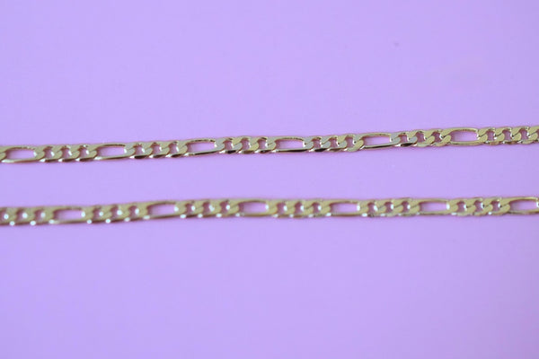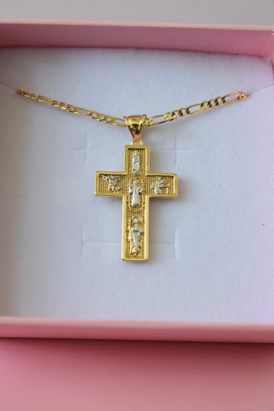18k bicolor yellow and white) gold plated square cross with saints such as Saint Jude, Mother Mary, and Saint Benedict on it. The cross comes on a figaro chain.