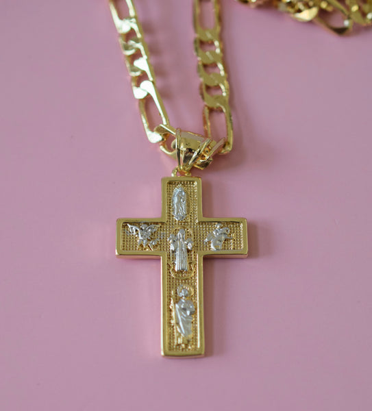 18k bicolor yellow and white) gold plated square cross with saints such as Saint Jude, Mother Mary, and Saint Benedict on it. The cross comes on a thick mens figaro chain. The length is 26 inches.