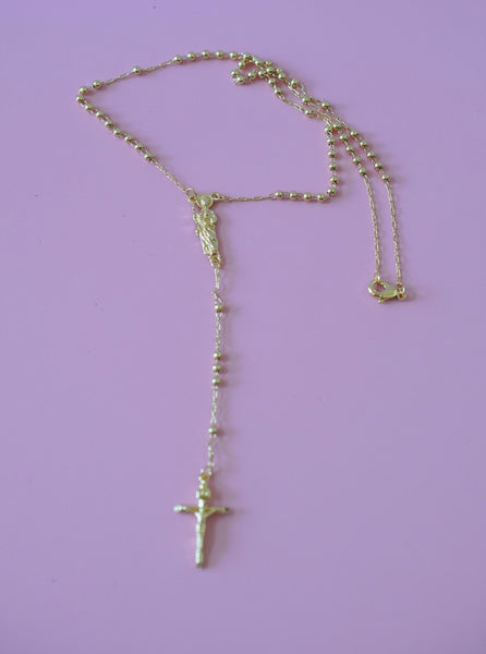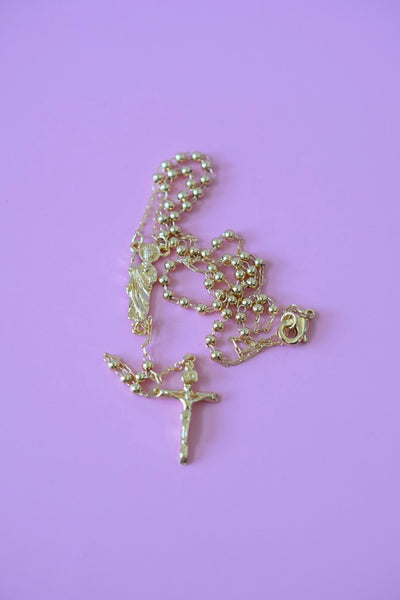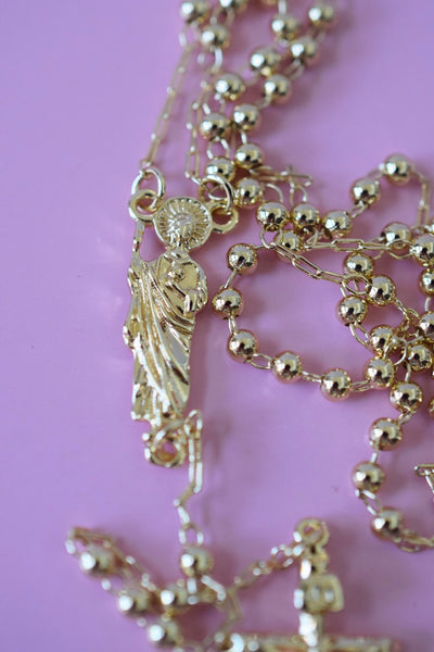 18k gold plated rosary style necklace featuring a Saint Jude charm in the middle and a crucifix at the bottom. This is around 18 inches and women's size. The beads are on the thinner dainty side.