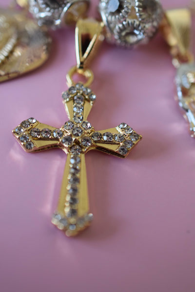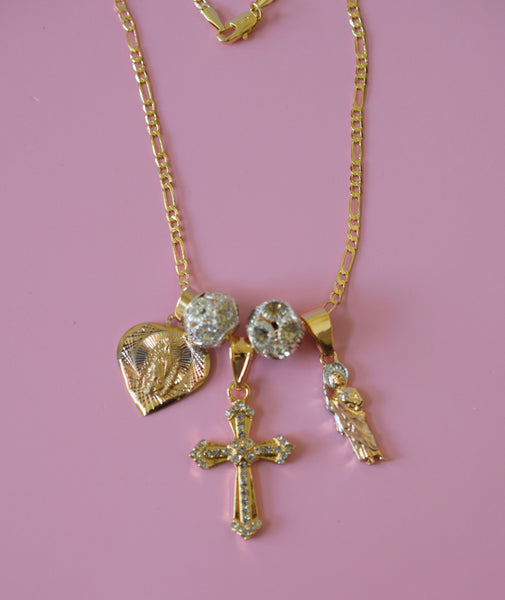 This charm necklace features our Diamond Cut Mary Heart, Icy Cross, And Tricolor Small Saint Jude. The cross is 18k gold plated. The Mary and Saint Jude are 18k tricolor gold plated. There are also shiny cz alloy silver tone balls dividing the charms. These charms can come off if you want to ever rearrange them or wear them on their own.