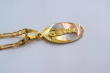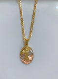 Tricolor gold plated oval Saint Jude pendant with amazingly shiny diamond cut detailing, giving it a lot of shine. The pendant sits on a classic gold plated figaro chain. Please select length. If you would like another chain style please inquire.