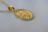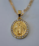 Small oval gold plated Saint Jude medallion with stunning detailing, surrounded by white and shiny stones. It sits on a classic gold plated figaro chain. Please state chain length in note box in cart. If not we will send 18 or 20 inches.