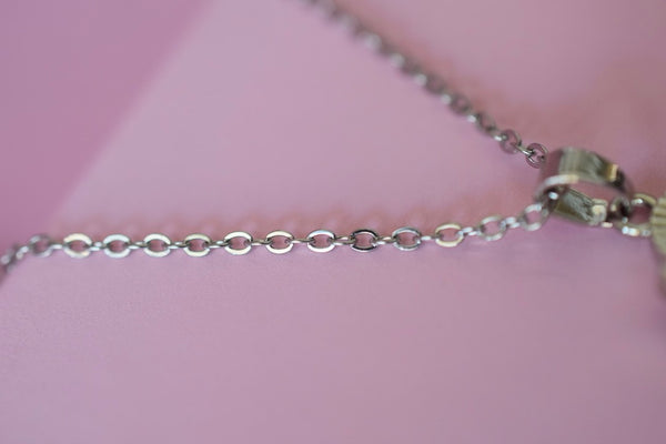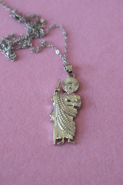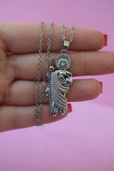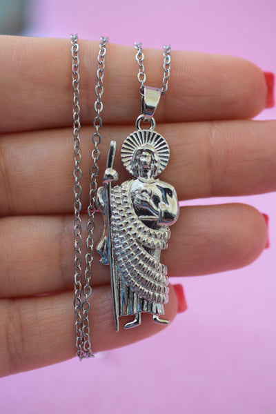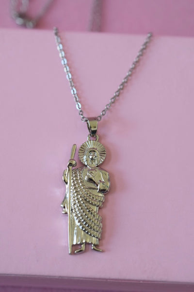 Metal: The Saint Jude charm is 18k white gold plated and the chain is silver tone alloy.