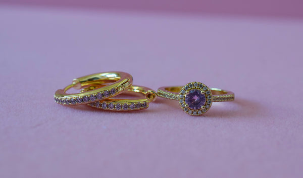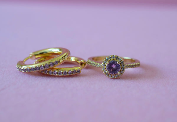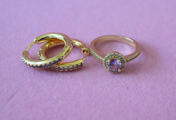 This is a package deal and set of our gold halo ring in pink and our icy huggie hoops in pink. They are each usually sold $26, giving them a $52 value. The metal is 18k gold plated. The stones are pink cz stones on the earrings. The ring is pink in the middle and white on the rest of the ring. Please select your size in the dropdown menu.