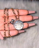Stainless steel round disk pendant that states "Your first breath took mine away." The chain is a figaro chain that is 18k yellow gold plated. It also comes with our stainless steel teddy bear.