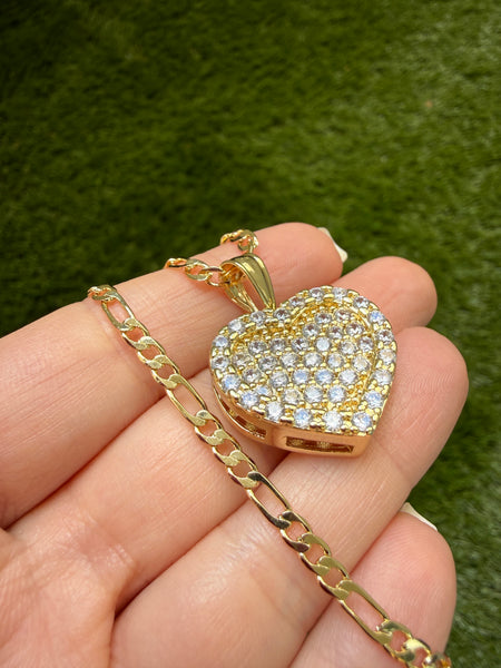 Only 1 was made of this beauty! This is is very high quality 18k gold plated and cubic zirconia heart necklace. The quality and craftsmanship replicates fine jewelry made with flawless diamonds. The pendant is a little under one inch wide. It is considered a medium sized pendant. But it is much smaller than the larger one we have.