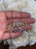 This is a bicolor necklace featuring our icy initials, our new white gold plated teddy charms, or sparkly divider balls, and our gold plated figaro chain. It is perfect for a kid or for an adult. For each letter, there is a bear. So if you order 3 letters, you get 3 bears.
