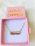 This is a custom 18K gold plated name plate. The font is old english. The name is handwritten with solid 925 sterling silver, and then dipped in 18k yellow gold. The name plate is on the thicker side.