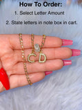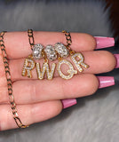 Beautiful gold plated initial pendant, encrusted with cz stones that are inspired by beautiful diamonds. 2 to 6 initials are divided by our sparkly slider ball pendants. The chain is a classic gold plated figaro chain.