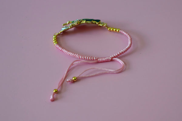 Adjustable 18k gold plated Saint Jude bracelet with a pink woven design.