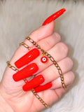 Adorable and dainty red eye pendant sitting on a gold plated figaro chain.